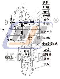 流量計(jì)是按節(jié)流元件,分流原理設(shè)計(jì)制造的;被測蒸汽進(jìn)入流量計(jì)主體后分為兩路,一路Q1通過節(jié)流孔板(此部分蒸汽不作計(jì)量),在孔板兩側(cè)產(chǎn)生壓差△P,在此壓差作用下,另一路Q2流經(jīng)噴嘴噴射在葉輪上,葉輪軸轉(zhuǎn)動(dòng)。為減慢葉輪軸轉(zhuǎn)速,葉輪軸下方按有阻尼葉片并浸沒在阻尼室內(nèi)水中。由于兩路有同一壓差△P,在規(guī)定流量范圍內(nèi),根據(jù)流體相似原理,兩路蒸汽流量Q1和Q2之間的比例關(guān)系基本為常量,這樣只要測出流經(jīng)噴嘴部分的流量Q2,即可知總流量Q。